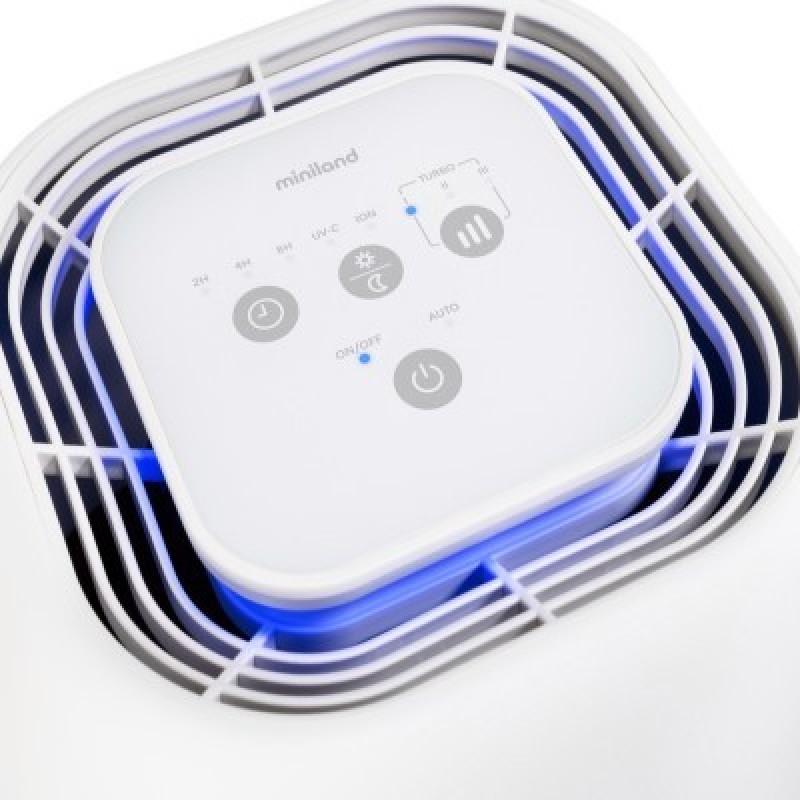 Miniland BabyPure 5 - самый современный очиститель воздуха с функцией ионизации для глубокой очистки. 5 уровней фильтрации: 1. Предварительный фильтр удаляет крупные частицы 2. HEPA фильтр удаляет мельчайшие частицы размером до 0,3 мкм (например, аллергены, пыльца, пыль или споры) 3. Фильтр с активированным углем поглощает нежелательные запахи в комнате. 4. Уровень очистки осуществляется с использованием ультрафиолетовых лучей, которые устраняют 99% бактерий, вирусов и микробов. 5. Еще более глубокий уровень с функцией ионизации для улавливания загрязняющих частиц с помощью отрицательных ионов. Помимо этого, умный гаджет имеет ряд отличительных особенностей и функций. 2 варианта ночного режима: без подсветки и как ночник (светильник с мягкой голубой подсветкой). Подходит для маленьких комнат в квартирах, загородных домах, офисах, площадью до 15 кв. метров. Цветовой индикатор качества воздуха. Таймер отключения. Сенсорная панель управления. 4 скорости потока (включая турбо-режим). Портативный. Красивый лаконичный дизайн впишется в интерьер любой, в том числе и детской комнаты. Бесшумный. Прост и безопасен в эксплуатации. Оснащен фильтром 3-в-1 для удаления пыли и неприятных запахов из воздуха